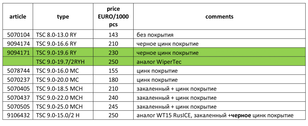 прайс на шипы указан в € за 1000 штук